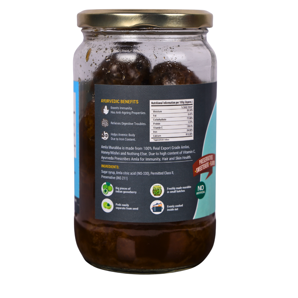 A traditional Indian superfood made with handpicked Indian gooseberries (Amla), slowly cooked in natural sugar syrup. Rich in Vitamin C, antioxidants, and essential nutrients, it helps boost immunity, improve digestion, and promote healthy skin and hair. With its sweet and tangy taste, Amla Murabba is not only a delicious treat but also a daily dose of wellness.
