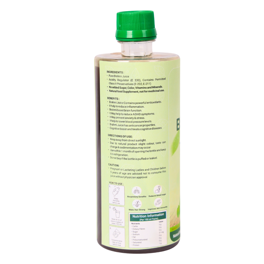 A refreshing Ayurvedic health drink made from pure Bacopa monnieri (Brahmi), an ancient herb known for its brain-boosting and memory-enhancing properties. Rich in antioxidants, Brahmi Juice helps improve focus, reduce stress, and support overall mental clarity. It also promotes healthy hair, skin, and general wellness. A natural choice for daily nourishment and cognitive strength.