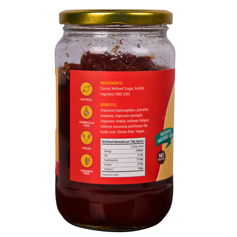 A traditional sweet preserve made from fresh, juicy carrots slowly cooked in natural sugar syrup. Rich in beta-carotene, vitamins, and antioxidants, Gajar Murabba supports eye health, boosts immunity, and improves digestion. With its delightful sweet taste and nutritional value, it is enjoyed both as a delicious treat and a natural health tonic for daily wellness.