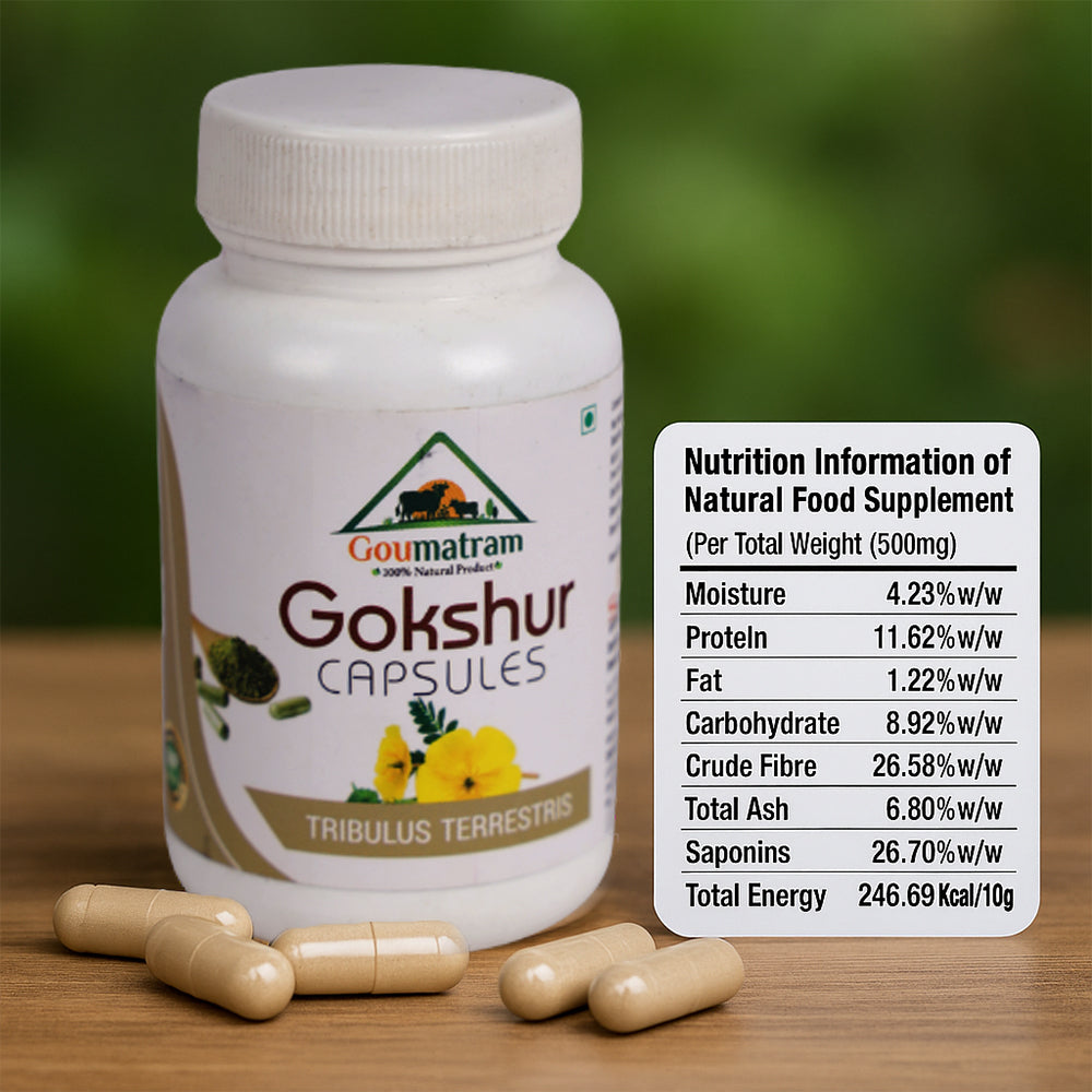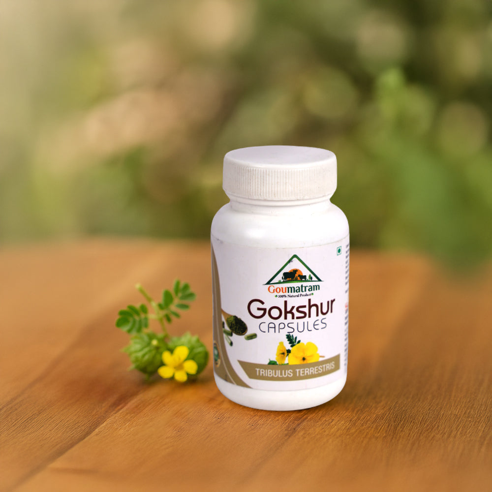 A natural Ayurvedic supplement made from Tribulus terrestris (Gokshura), known for its rejuvenating and revitalizing properties. Gokshur Capsules support kidney and urinary tract health, help maintain healthy prostate function, and promote overall vitality. Traditionally used as a natural strength enhancer, it also aids in boosting stamina, improving energy, and supporting reproductive wellness.