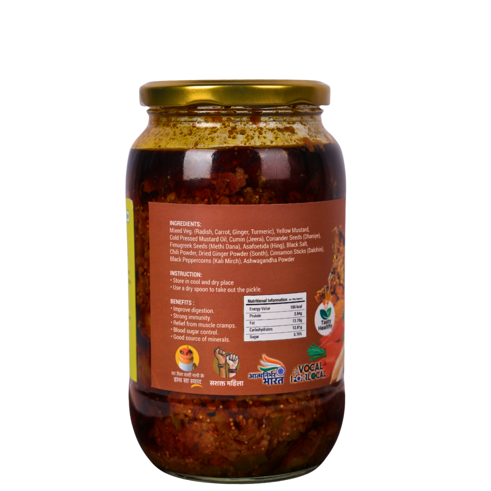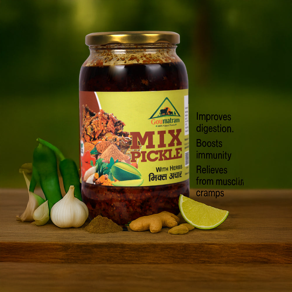 A traditional Indian pickle made from a tangy blend of seasonal vegetables and fruits, carefully spiced and preserved in natural oils. Rich in flavor and nutrients, Mix Pickle adds a zesty punch to every meal while supporting digestion and appetite. Perfect as a side dish for rotis, parathas, rice, and curries, it delivers a delightful combination of taste and wellness in every bite.