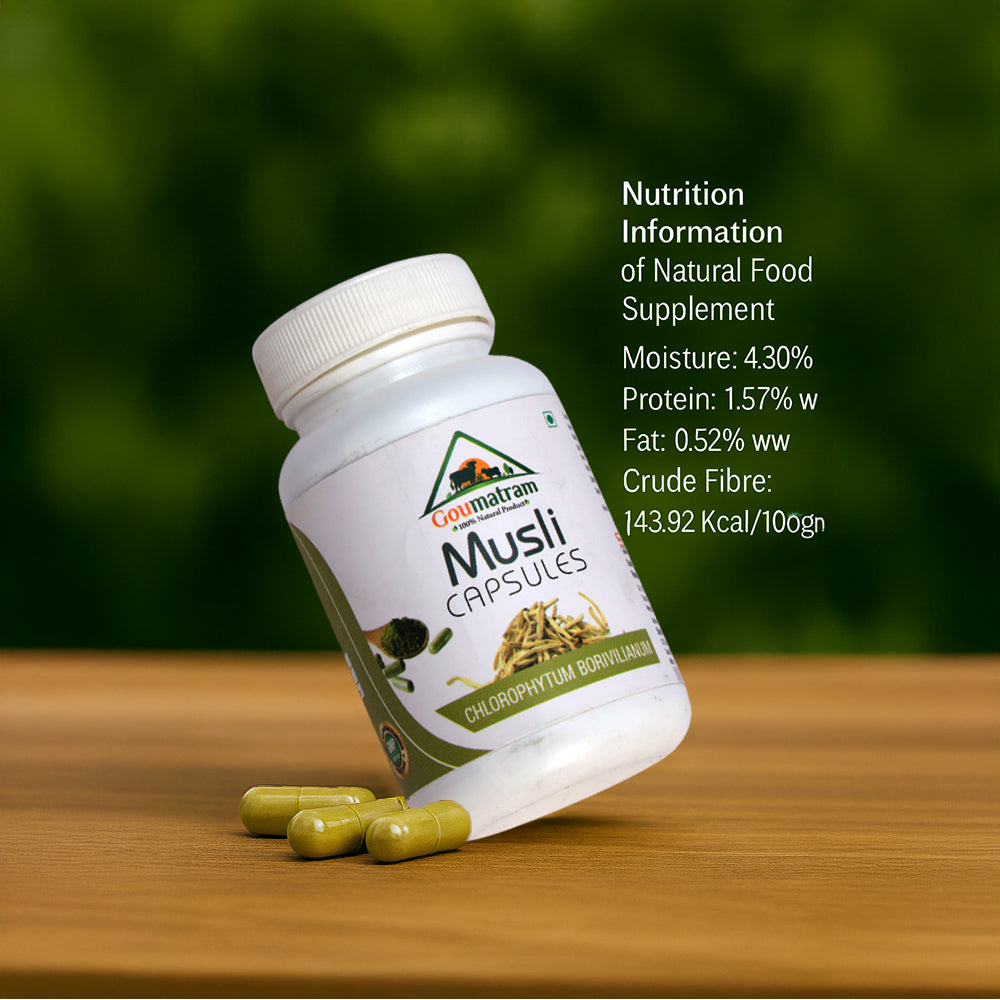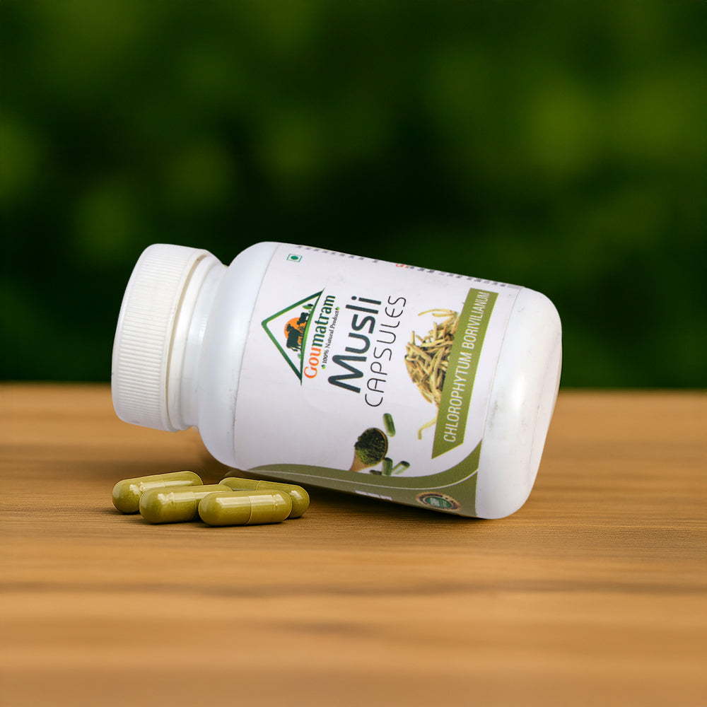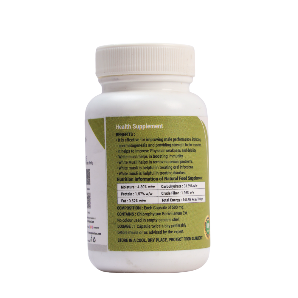 A natural Ayurvedic supplement made from Safed Musli (Chlorophytum borivilianum), known for its rejuvenating and aphrodisiac properties. Musli Capsules help enhance stamina, improve vitality, support immunity, and promote overall wellness. Rich in natural bioactive compounds, they are ideal for maintaining strength, endurance, and holistic health conveniently in a daily dose.