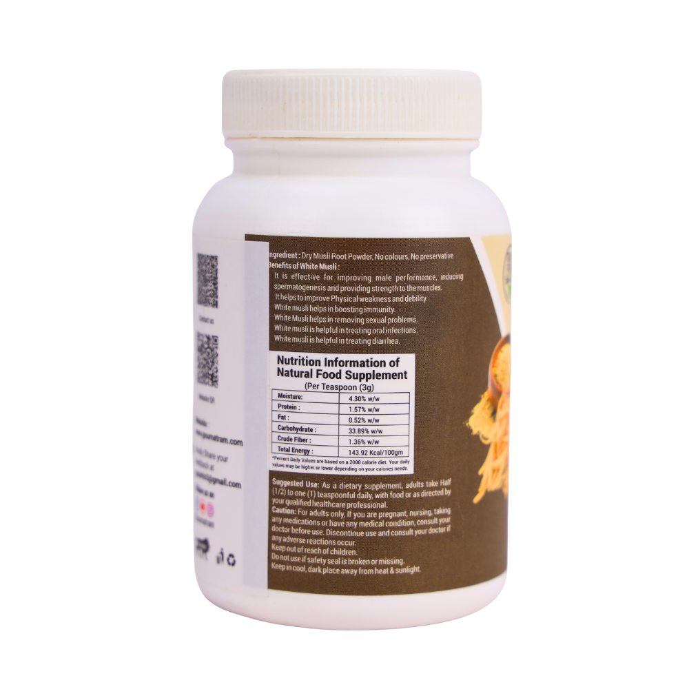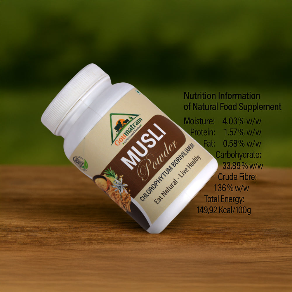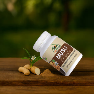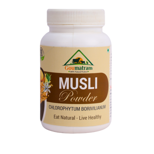 A potent Ayurvedic herbal supplement made from Safed Musli (Chlorophytum borivilianum) roots, renowned for its rejuvenating and vitality-boosting properties. Musli Powder helps enhance stamina, improve energy levels, support reproductive health, and promote overall wellness. Rich in natural antioxidants, it also aids in strengthening immunity and maintaining healthy muscle and bone function. A natural choice for daily health and vitality.