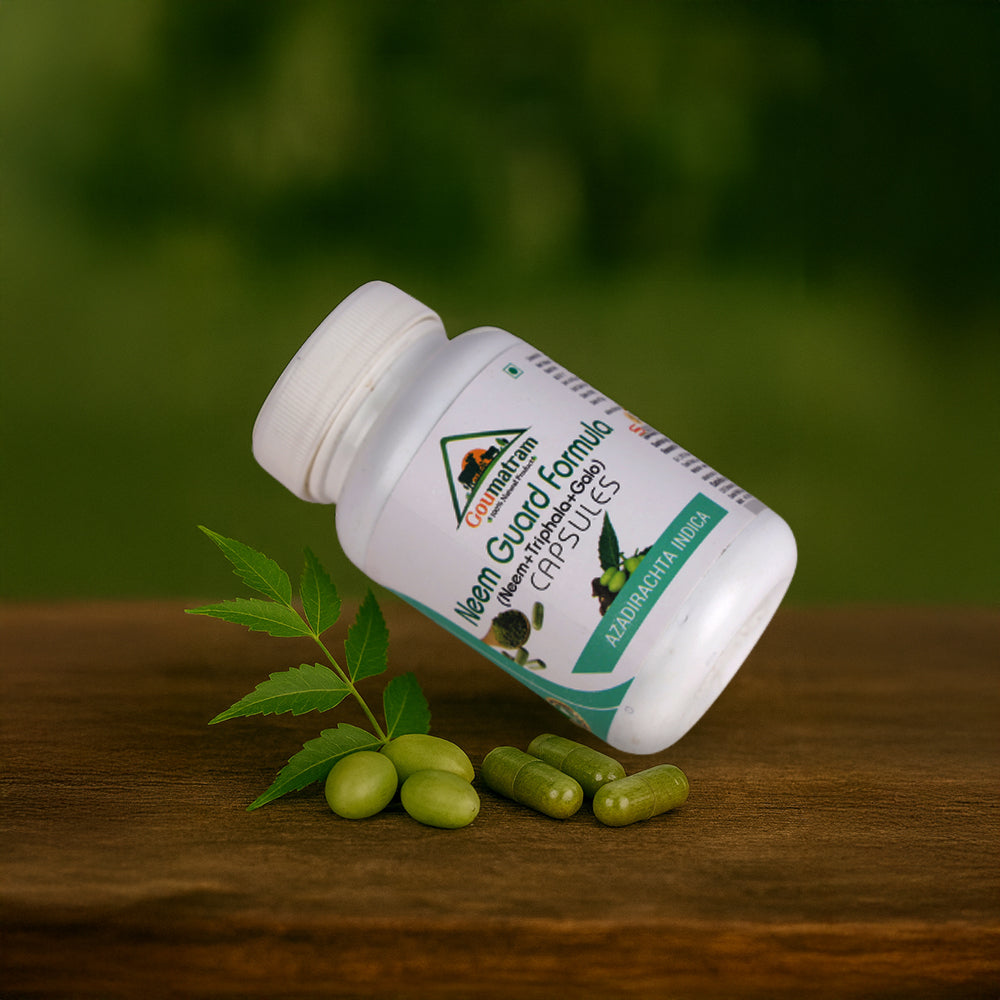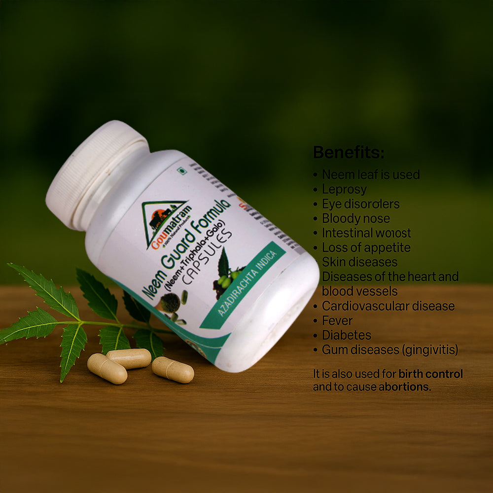 A potent Ayurvedic supplement combining the natural goodness of Neem, Triphala, and Galo. These capsules help purify the blood, support healthy digestion, strengthen immunity, and promote overall wellness. Rich in antioxidants and natural bioactive compounds, Neem Guard Formula Capsules are ideal for maintaining internal balance, improving skin and oral health, and boosting vitality conveniently.