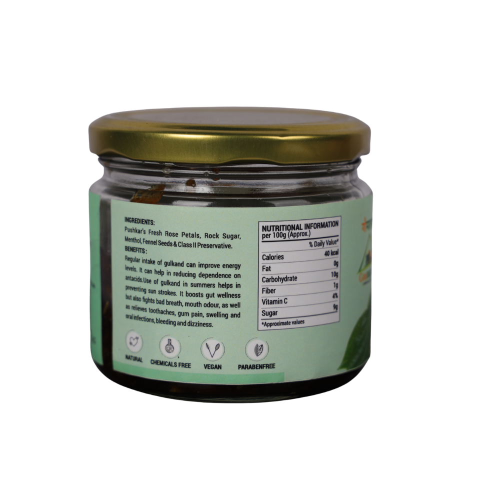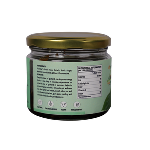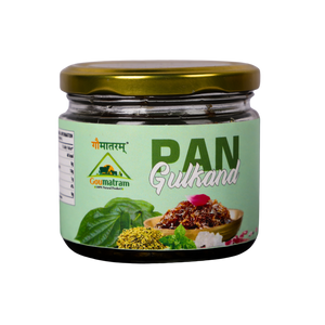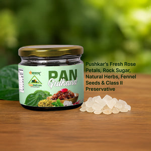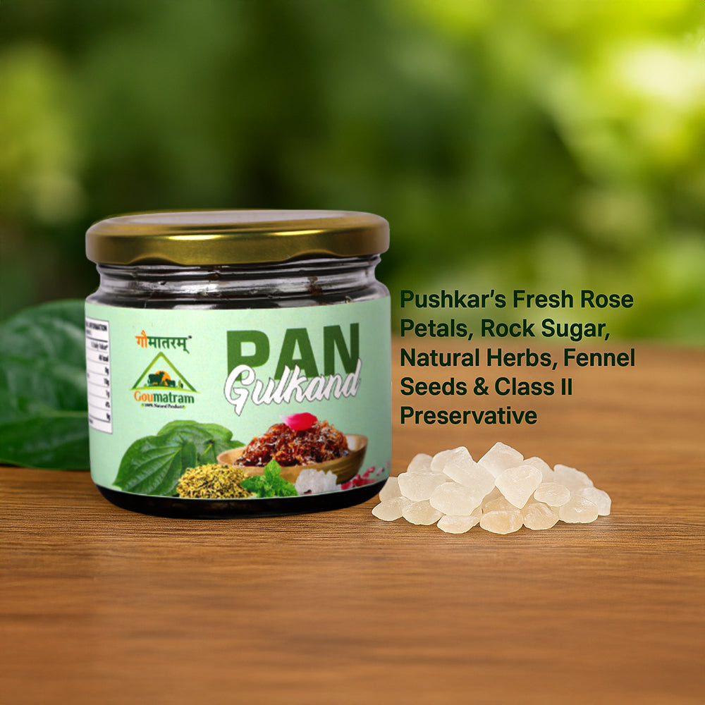 A traditional Ayurvedic delicacy combining sun-cooked rose petals (Gulkand) with refreshing betel leaves (Pan). Rich in antioxidants and natural cooling properties, Pan Gulkand helps relieve acidity, improve digestion, and freshen breath. Its sweet, aromatic flavor makes it a delightful after-meal treat, promoting overall wellness and a refreshing taste experience naturally.