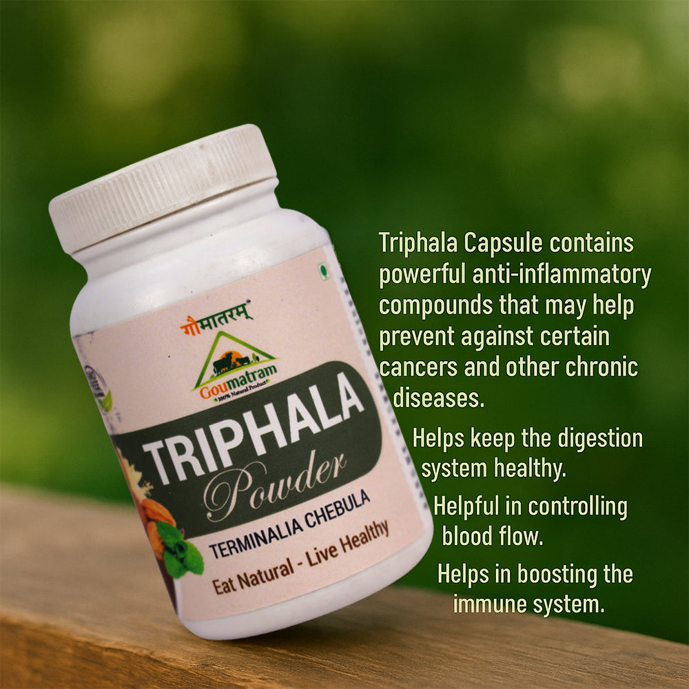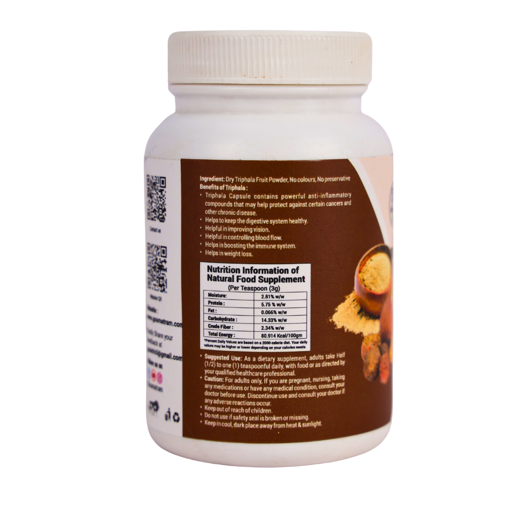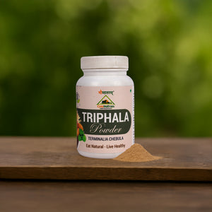 A potent Ayurvedic herbal supplement made from the dried fruits of Amla, Haritaki, and Bibhitaki. Triphala Powder is renowned for its detoxifying and digestive properties. It supports healthy bowel movements, improves metabolism, boosts immunity, and promotes overall wellness. Rich in antioxidants and natural nutrients, it helps maintain internal balance, enhance vitality, and support holistic health naturally.